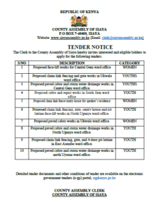 The Clerk to the County Assembly of Siaya hereby invites interested and eligible bidders to apply for the following tenders.
