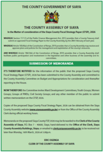 In the matter of consideration of the Siaya County Fiscal Strategy Paper (CFSP), 2026 , The Committee on Budget and Appropriations invites Ward Development Committees, Youth Groups, Women Groups, Groups of PWDs, Civic Society Groups and any other member of the public to submit written memorandum to The Clerk of the County Assembly of Siaya ; P O Box 7- 40600, Siaya ; Hand-delivered to the Office of the Clerk, Siaya County Assembly Building, Siaya ;or emailed to clerk@siayaassembly.go.ke; to be received not later than Monday, 16th March, 2026 at 5.00 pm.