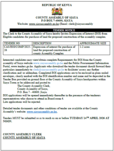 The Clerk of the County Assembly of Siaya hereby invites Expression of Interest (EOI) from Eligible candidates for purchase of Land for the Proposed construction of County Assembly Complex .